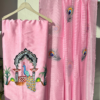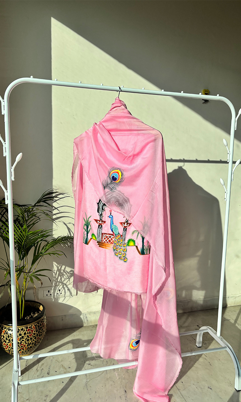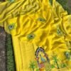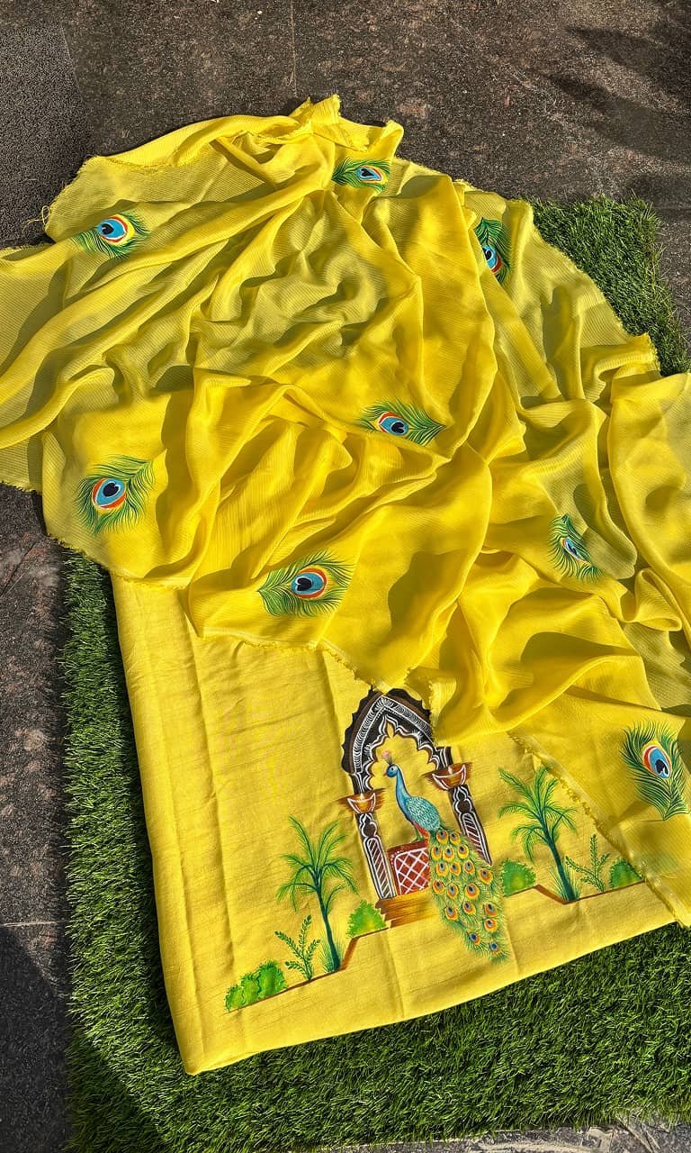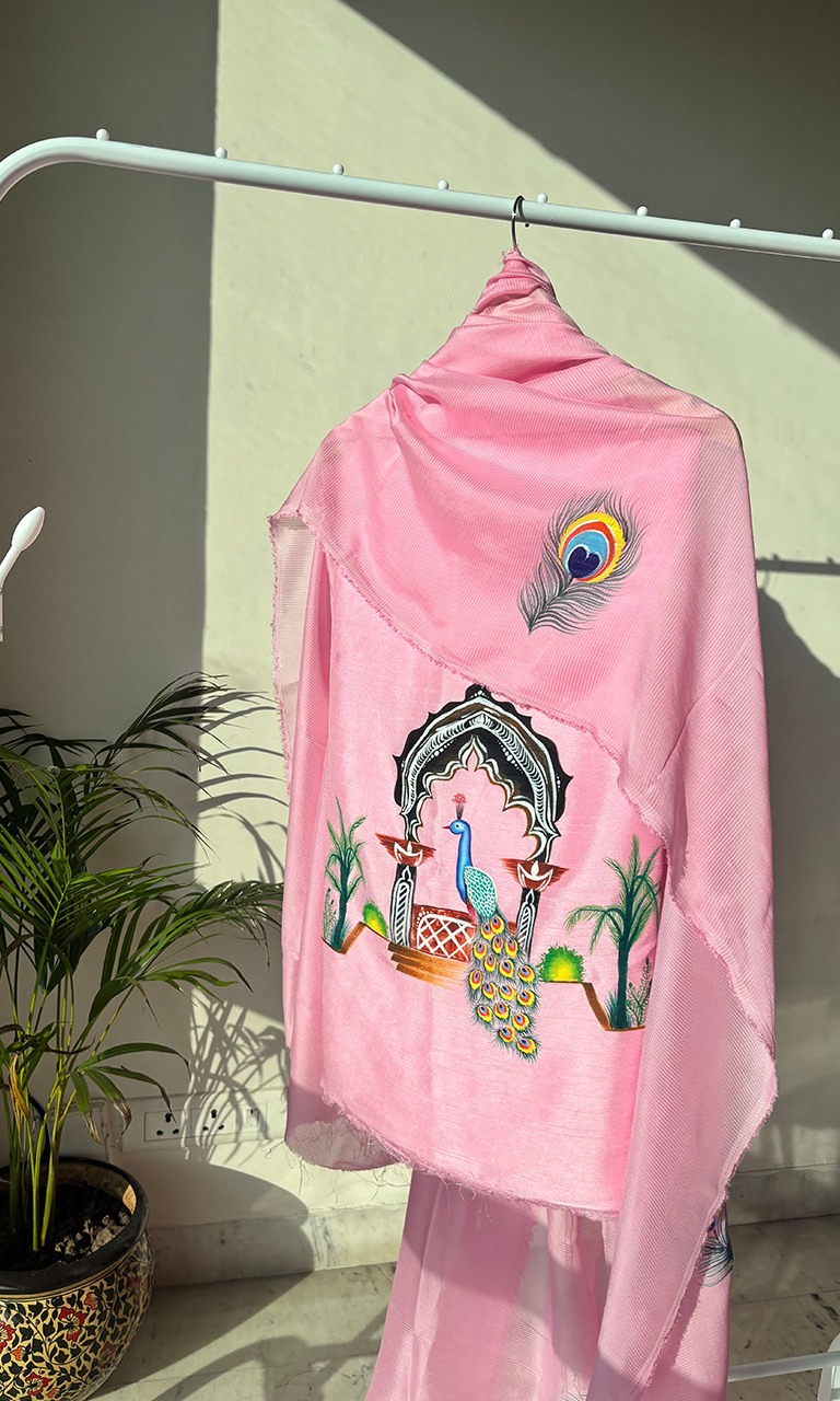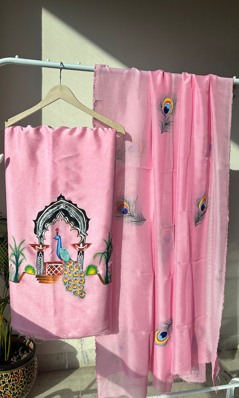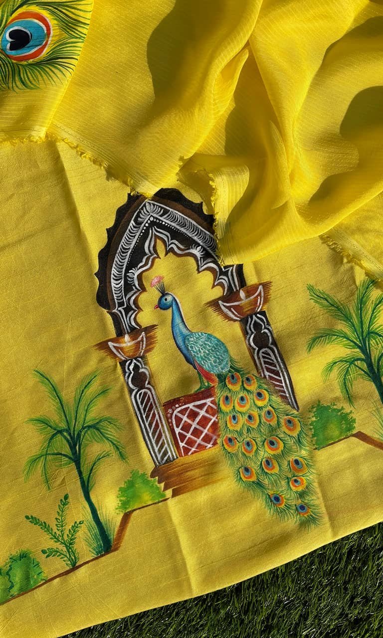 MayurPankhi – Richness of Mughal Art is a striking ensemble crafted in a vibrant yellow palette, celebrating the artistry of peacock motifs and traditional architectural influences. The suit showcases finely detailed hand-rendered designs that radiate cultural richness while maintaining a fresh, wearable appeal.