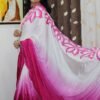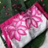 Nazakat Ae Lily is crafted in smooth Dola silk featuring a delicate ombré transition of magenta into white, creating a soft yet striking canvas for its blooming lily motifs. The floral artwork flows along the length of the saree, elevated with a silver embroidered border and fine embroidery placed artistically between the flowers, adding luminous detail and gentle texture.