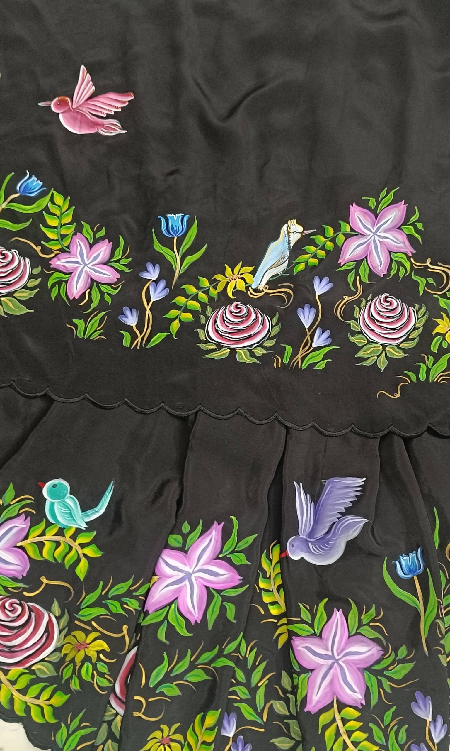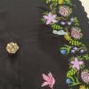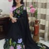 The saree is finished with delicate embroidered border detailing, adding refined shimmer while elegantly framing the artwork. Its dramatic colour palette and rich florals make this saree perfect for evening functions, festive celebrations, cultural gatherings, and special occasions that call for statement elegance.
