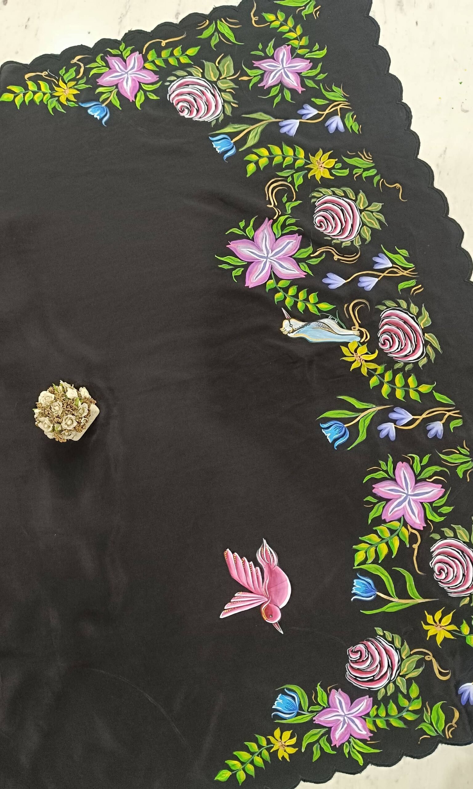 Minor variations in brush strokes, embroidery placement, motif detailing, and slight colour differences may occur due to lighting conditions, screen settings, and artisanal processes. These variations are inherent to handmade creations and enhance the individuality of each piece.