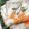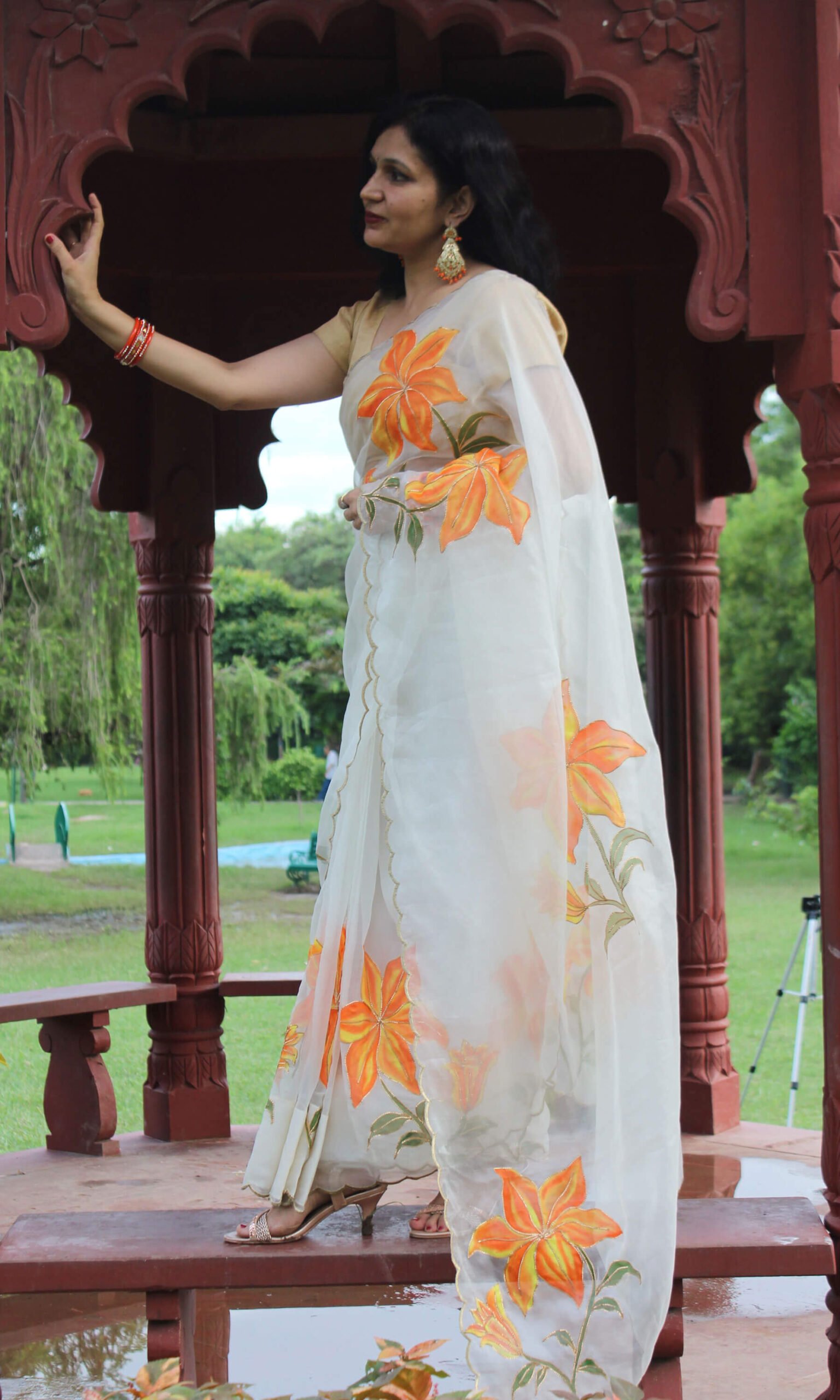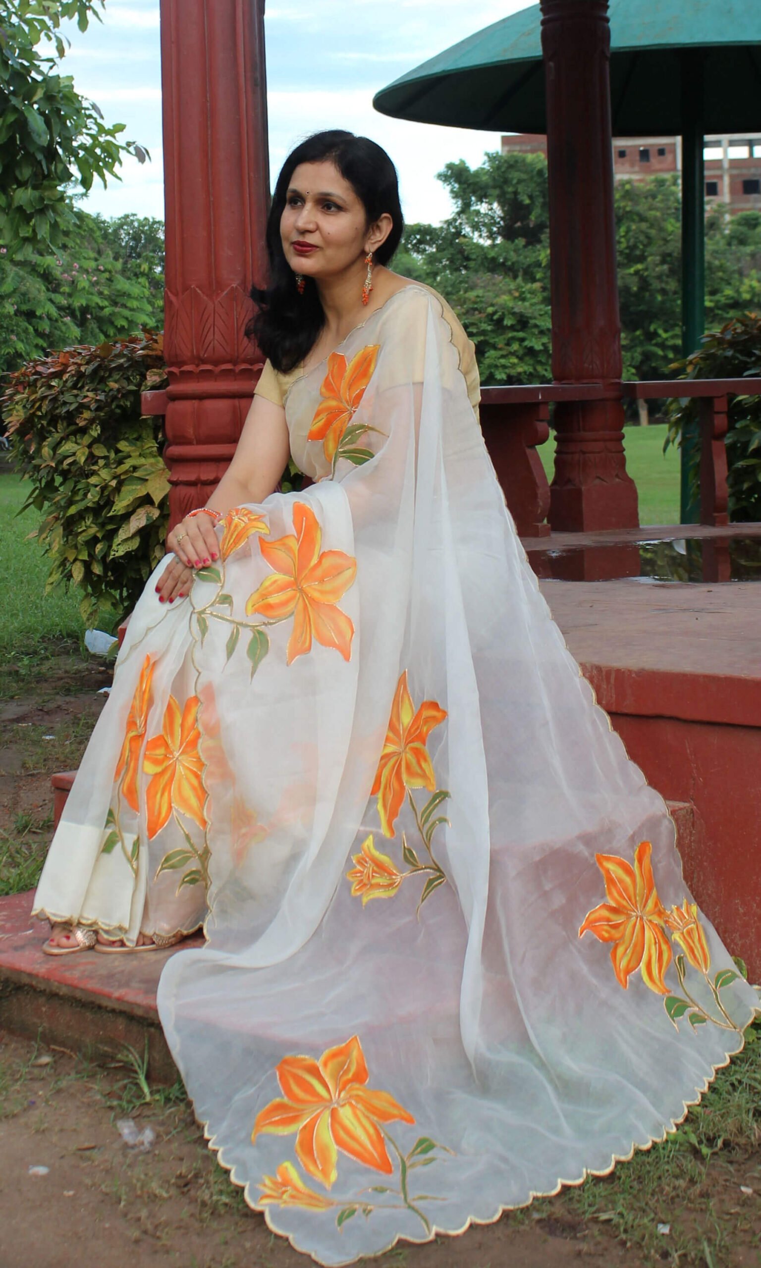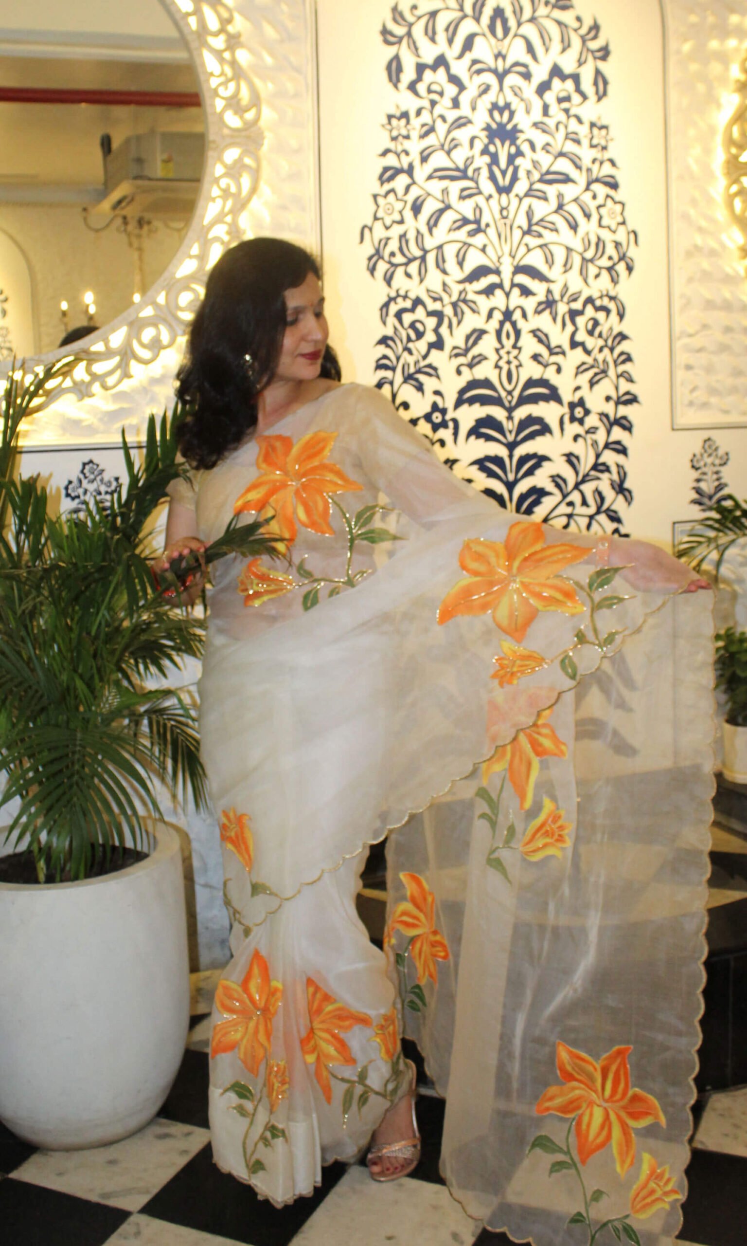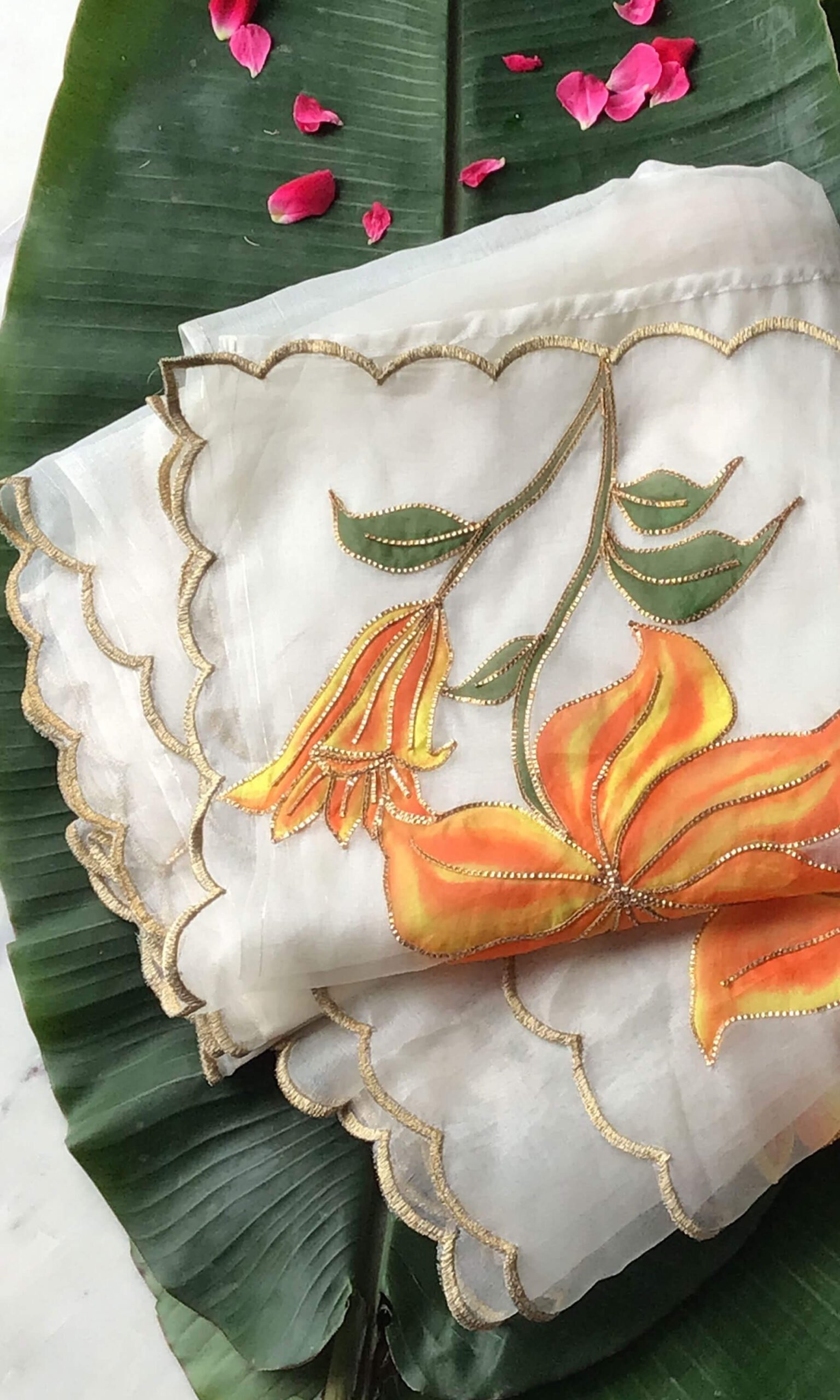 Sukriti’s Orange Lily Whisper feather-light texture and beautiful translucent drape. The saree is adorned with vivid hand-painted lily motifs, delicately traced with gutta embroidery outlining each flower, creating dimensional definition and refined detail.