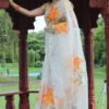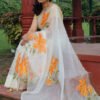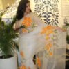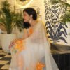 The edges are finished with a graceful embroidered border, adding subtle structure to the airy flow of the saree. The warm orange florals against the soft, sheer base create a striking yet elegant contrast — perfect for daytime festivities, intimate wedding events, or refined cultural gatherings.